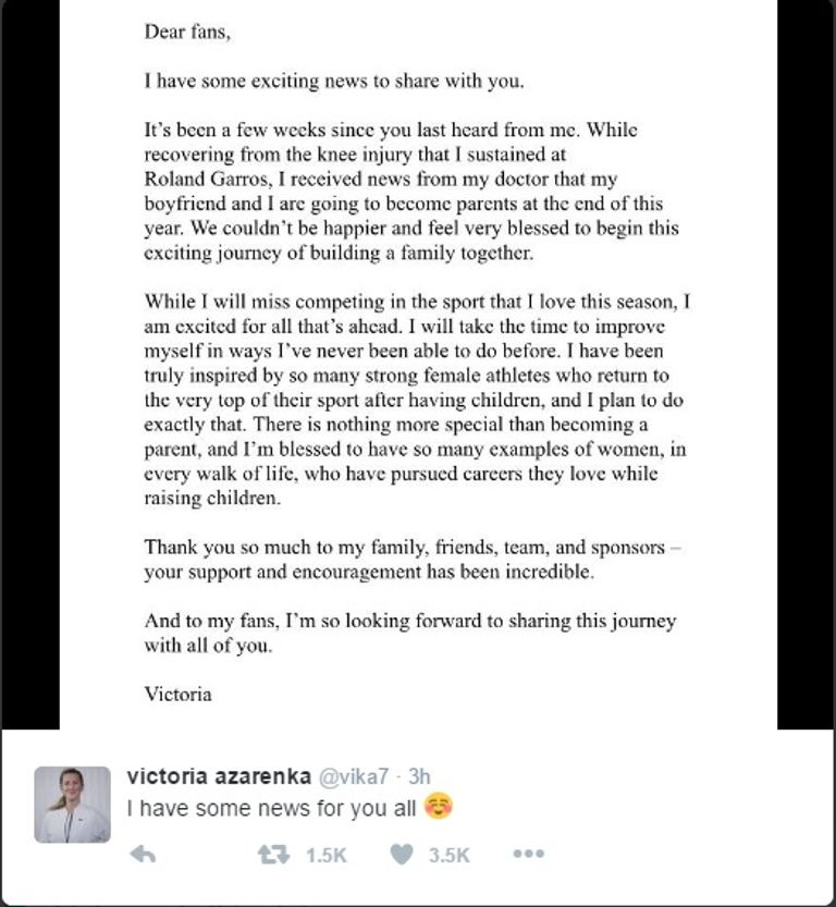 وكتبت المصنفة الأولى على العالم سابقا عبر حسابها بتويتر "بينما كنت أتعافى من إصابة الركبة التي تعرضت لها في بطولة فرنسا تلقيت نبأ من طبيبي بأنني وصديقي سنصبح آباء بنهاية العام الحالي".