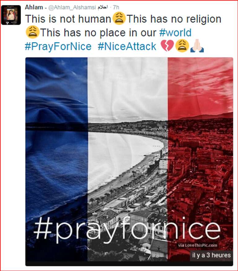 ونشرت أحلام صورة العلم الفرنسي تدعو إلى الصلاة من أجل "نيس" وكتبت بالإنجليزية ما معناه "هذا ليس إنسانا.. هذا لا دين له.. هذا ليس له مكان في عالمنا".