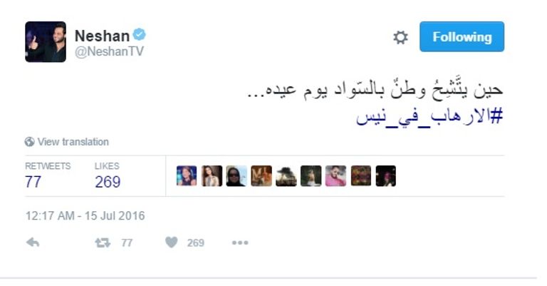 وعلق الإعلامي اللبناني نيشان على الحادث عبر حسابه بموقع "تويتر" وكتب "حين يتَّشِحُ وطنٌ بالسّواد يوم عيده... #الإرهاب_في_نيس".