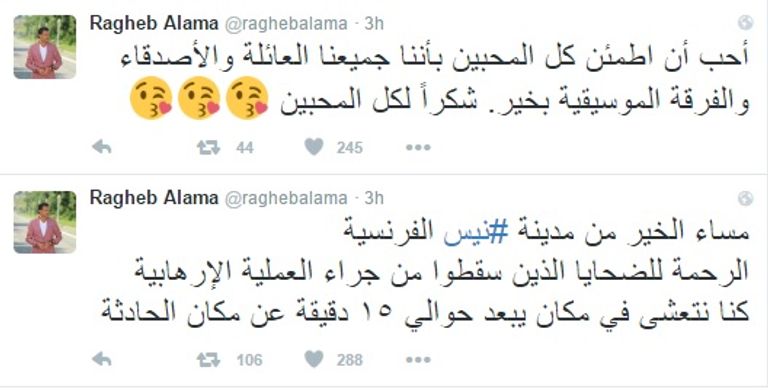 وكتب راغب علامة عبر حسابه بموقع "تويتر" بعد وقت قصير من وقوع الحادث" "مساء الخير من مدينة نيس الفرنسية الرحمة للضحايا الذين سقطوا من جراء العملية الإرهابية، كنا نتعشى في مكان يبعد حوالي ١٥ دقيقة عن مكان الحادثة".