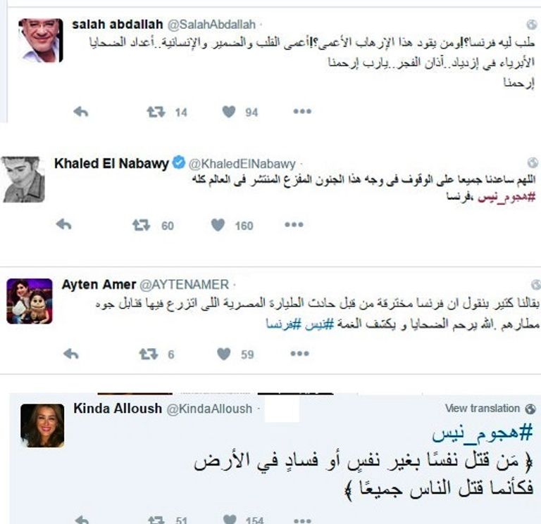 وكان الفنان العالمي سامي يوسف من أول المعلقين على الهجوم المروع حيث كتب عبر حسابه بموقع "تويتر" بعد ساعات من وقوعه "اليوم الأسود.. صلوا من أجل نيس".