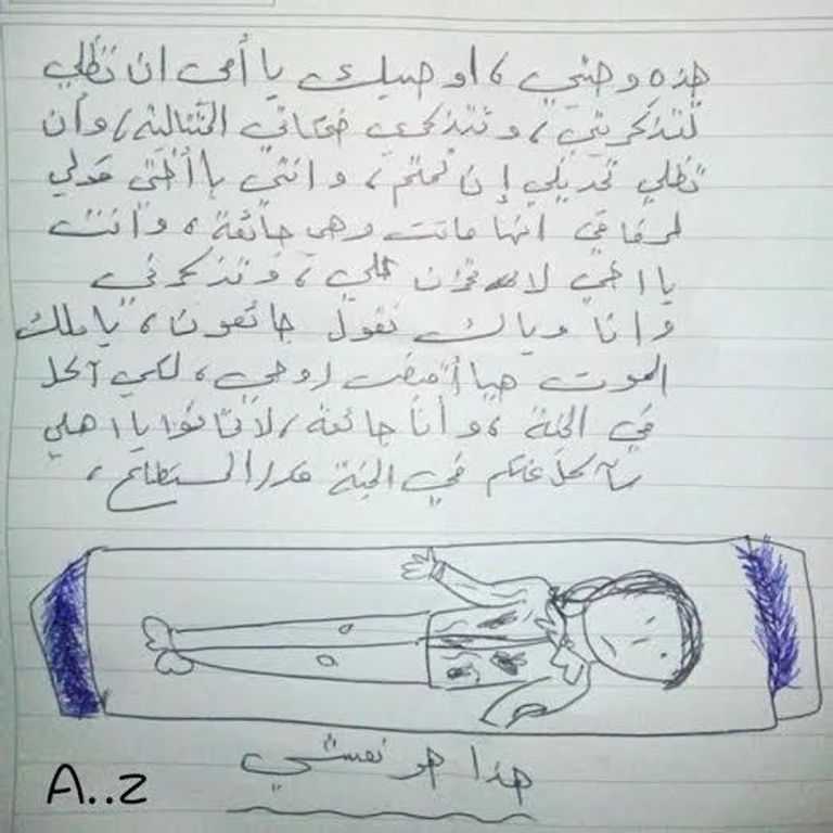 رهف صاحبة الأعوام العشرة، رسمت إلى جانب وصيتها صورة لطفلة في تابوت، مذيلة إياها بعبارة "هذا هو نعشي" ووضعتها تحت وسادتها ونامت استعدادا للموت، بعدما سئمت انتظار والدتها التي ذهبت باحثة عن طعام لن يملأ معدة اشتد بها الجوع.