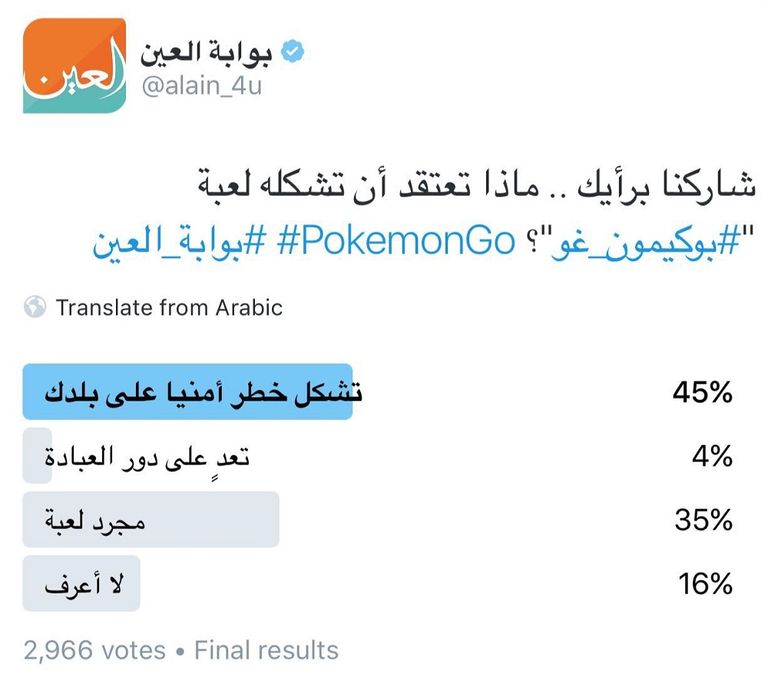 وجاء سؤال الاستطلاع كالتالي "ماذا تعتقد أن تشكله لعبة بوكيمون جو أو PokemonGo؟ وتحديد أربع إجابات هي "1- تشكل خطرًا أمنيًا على بلدك" أو "2- تعدٍ على دور العبادة" أو "3- مجرد لعبة" أو "4- لا أعرف".