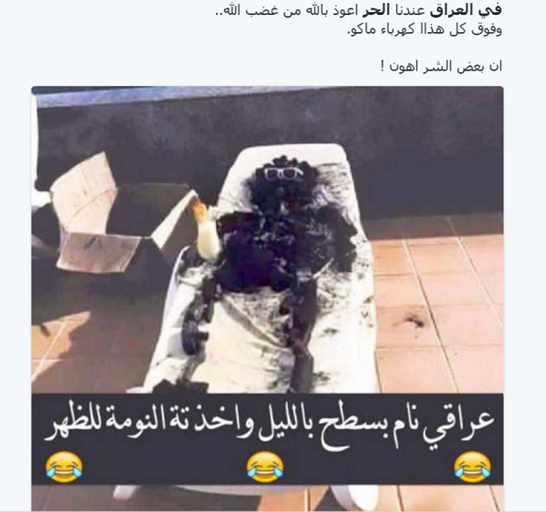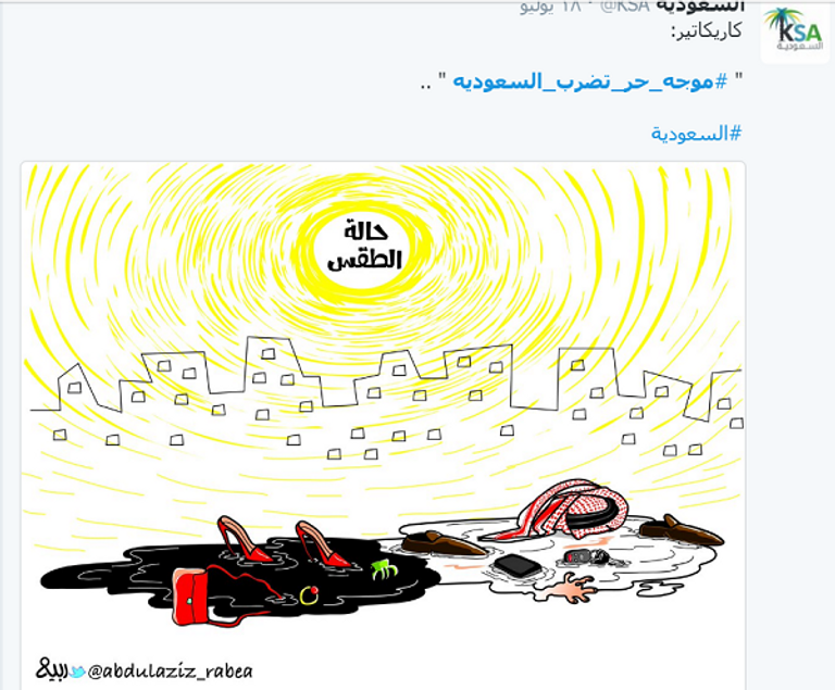 وتداول رواد مواقع التواصل الاجتماعي تعليقات طريفة حول الموجة شديدة الحرارة، وخاصة من العراق والسعودية، حيث نشر مغرد فيديو لضب يحاول الهروب من موجة الحر في إحدى المناطق الصحراوية بالسعودية، فيغامر بحياته بحثاً عن الظل ويتوقف تحت شاحنة.