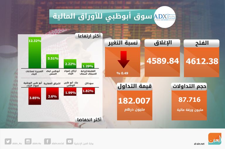 وأغلق مؤشر سوق "أبوظبي المالي" خاسرا 0.49% بما يعادل 22.54 نقطة ليغلق عند 4589.84 نقطة، بعد التداول على 87.716 ورقة مالية حققت سيولة 182.007 مليون درهم.