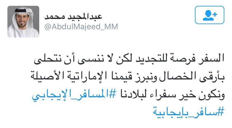 دعت عهود الرومي، وزيرة الدولة للسعادة، في برنامج التواصل الاجتماعي "تويتر"، في تغريدة لها "شاركوني تجاربكم ومواقفكم في السفر ورؤاكم عن #المسافر_الإيجابي الذي يمثل خير سفير لوطنه وقيم مجتمعه عبر وسم #سافر_بإيجابية".