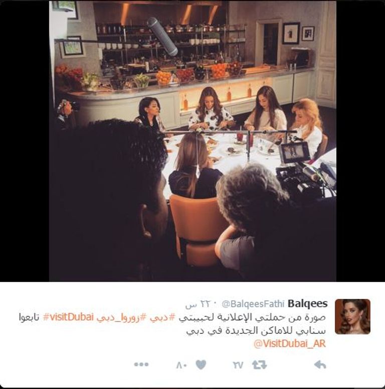 أعلنت الفنانة الإماراتية بلقيس عبر صفحتها في موقع التواصل الاجتماعي "تويتر"، عن مشاركتها في تصوير الحملة الإعلانية "زوروا دبي".
