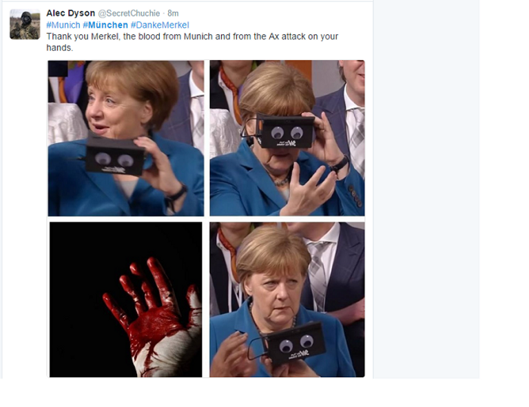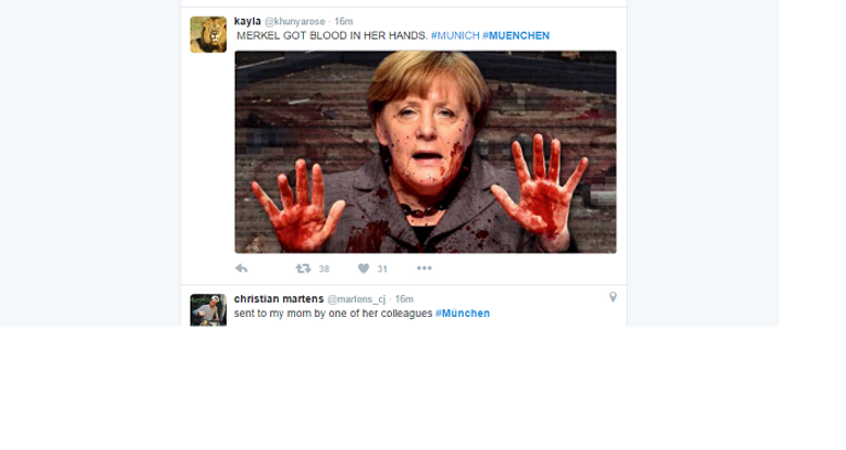 وكتب آخرون: "شكرًا يا ميركل، فدماء الضحايا في يديك، سواءً من سقطوا في ميونيخ أو في هجوم الأفغاني على ركاب القطار!".
