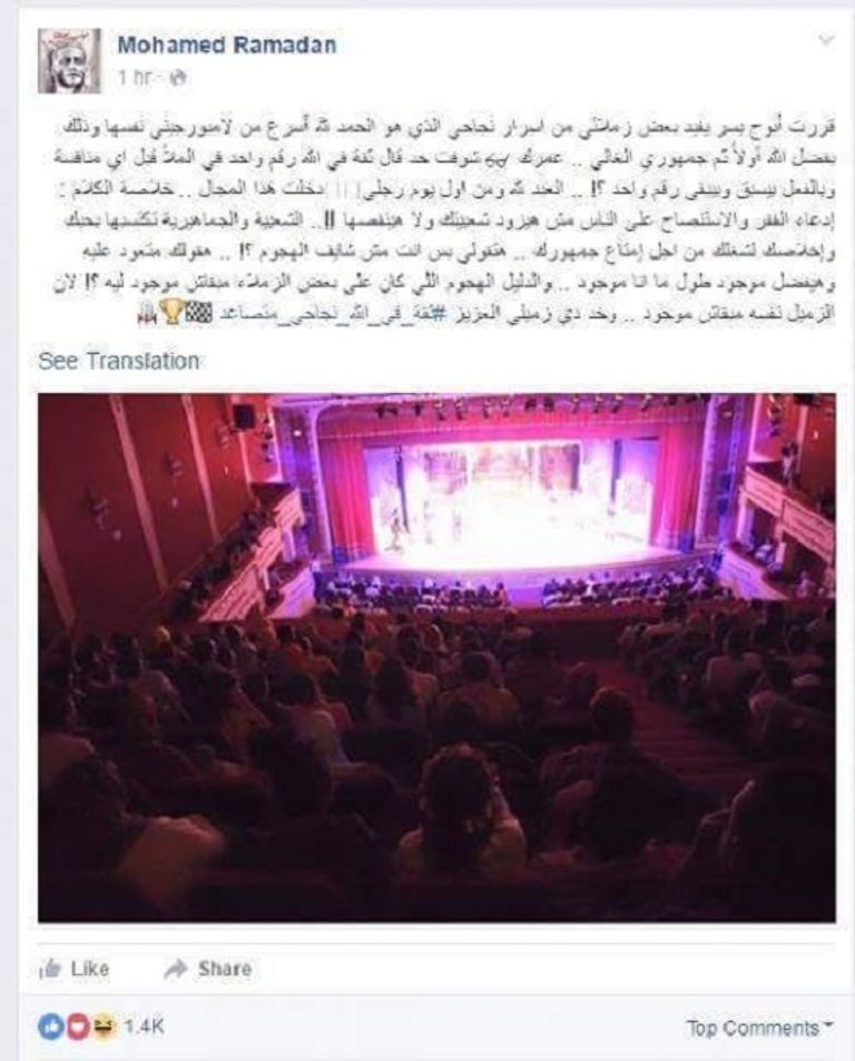 وكتب عبر صفحته تعليقاً جاء فيه:" دي الميني القديمة بتاعتي اللي كانت معايا في فيلم ظرف طارق، والناس اللي فهمت أنها بغرض إني باوجه رسالة لزميلي الفنان محمد رمضان، وهذا ما أحزنني كثيراً".