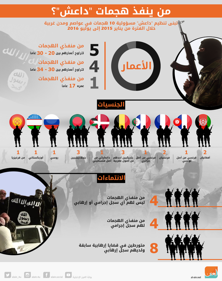 وفي تحليل لآخر 10 هجمات شهدها العالم، تناولت بوابة "العين" الإخبارية خمسة محاور رئيسية وهي أعمار، وجنسيات المنفذين، ودراستهم أو المهنة، وهل ما إذا كانوا مهاجرين قبل ظهور داعش أو بعدها، وما طبيعة علاقتهم بالجماعات الإرهابية، في محاولة للإجابة على هذه التساؤلات التي يبدو أنها ستظل رهن بحث خلال الفترة المقبلة.