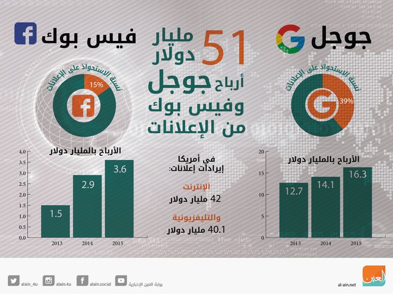 وبحساب صافي أرباح الإعلانات لدى جوجل وفيس بوك خلال الـ 3 سنوات الماضية، يتبين اتجاه شركة google للهيمنة المطلقة على سوق الإعلانات بفارق يصل من 10 إلى 12 مليارًا سنويًّا عن أقرب منافسيها facebook مع الوضع في الاعتبار استحواذ جوجل على موقع الفيديوهات يوتيوب.