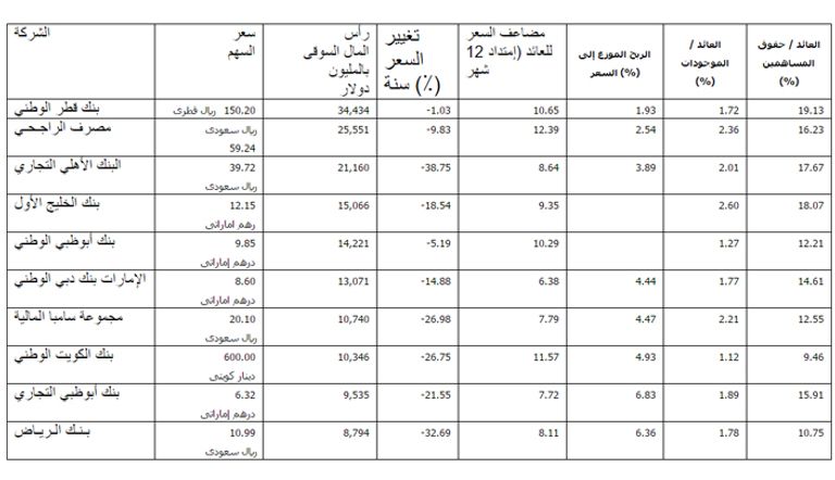 وتصدر بنك قطر الوطني القائمة من حيث القيمة السوقية، بـ 34.43 مليار دولار، في حين جاء بنكا "الخليج الأول" و"أبوظبى الوطني" ليحتلا المركزين الرابع والخامس بقيمة سوقية 15.066 مليار دولار و14.221 مليار دولار على الترتيب.