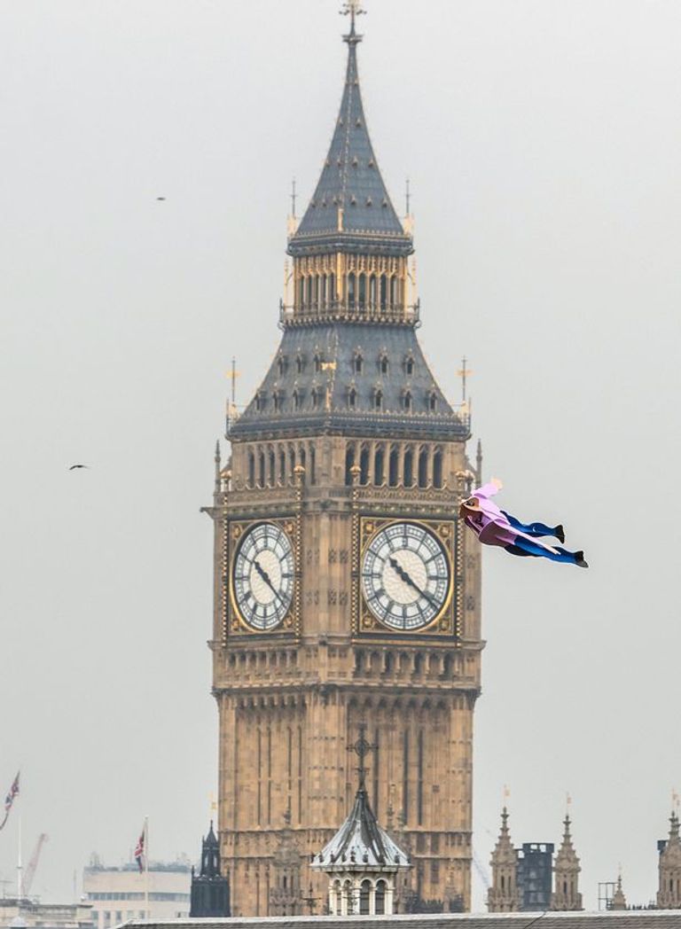 الذهول والدهشة كانا سيدا الموقف حينما رأى سياحا يزورن معالم لندن أشخاصاً يطيرون برشاقة فوق مبنى البرلمان وعين لندن.