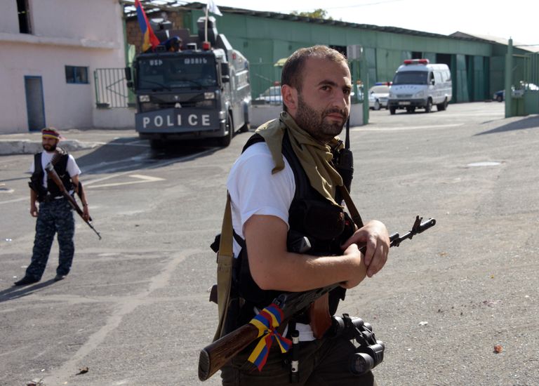 واقتحم المسلحون، وهم من أنصار المعارض المسجون جيراير سيفيليان، مبنى قوات الأمن في 17 يوليو/ تموز وقتلوا شرطيًا واحتجزوا عددًا من الأشخاص رهائن؛ مطالبين باستقالة الرئيس سيرج سركيسيان.