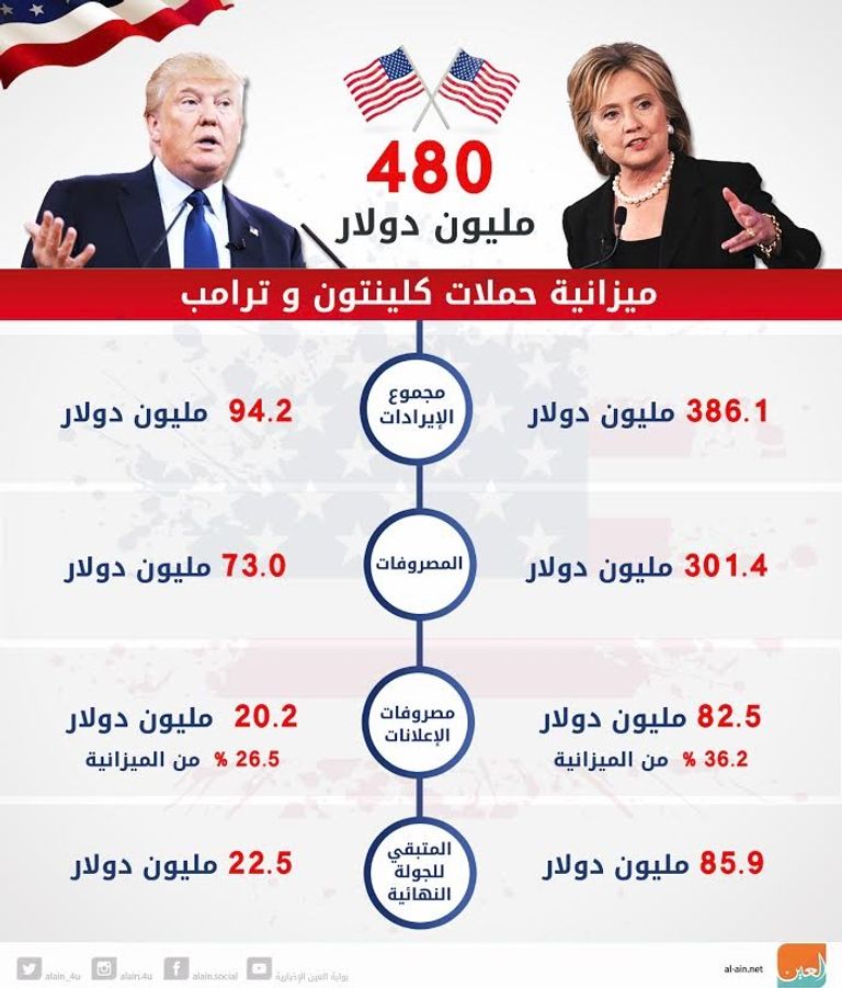 بعد فوز كل من هيلاري كلينتون ودونالد ترامب بالترشح الرسمي لخوض انتخابات الرئاسة، تعرف على المبالغ التي تم دفعها في حملة كل منهما