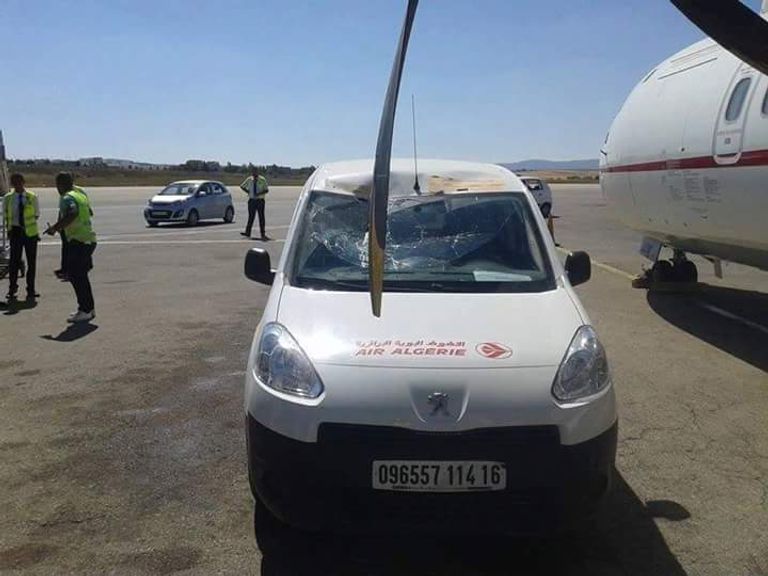 وفي حادثة أخرى لا تقل غرابة، اصطدمت طائرة على مدرج مطار بالعاصمة الجزائر مع سيارة تابعة للخطوط الجوية الجزائرية، مما أدى إلى تحطم زجاج السيارة.