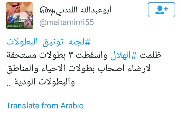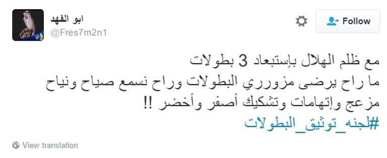 على الجهة الأخرى تباينت تغريدات جماهير الهلال بين التأكيد على صحة الترتيب والسخرية من تغريدات جماهير النصر، فقال هلالي: "مع ظلم الهلال باستبعاد 3 بطولات، ما راح يرضى مزوّري البطولات وراح نسمع صياح ونياح مزعج واتهامات وتشكيك أصفر وأخضر!!".