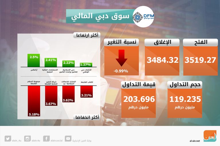 وأغلق مؤشر سوق دبي المالي باللون الأحمر خاسرًا 0.99% إلى 34.95 نقطة إلى 3484.32 نقطة، بعد التداول على 119.235مليون ورقة مالية حققت سيولة 203.696 مليون درهم تم تنفيذها خلال2.187 صفقة.