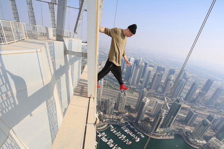 3- يقف على قدم واحدة في إحدى قمم ناطحات السحاب في دبي.