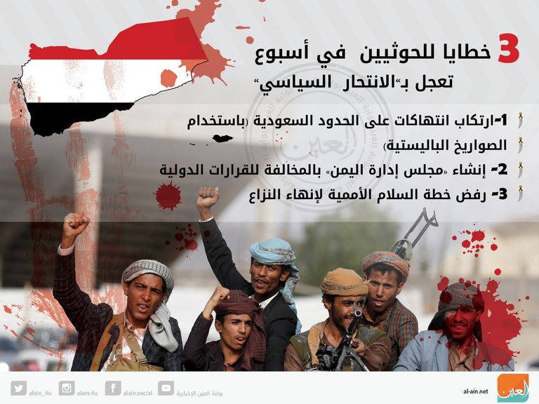 إنفوجراف .. 3 خطايا للحوثيين في أسبوع تعجل بـ"الانتحار السياسي"