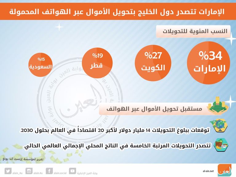 بحسب تقرير لمؤسسة "إرنست أند يونغ لعام 2015، الإمارات استحوذت على نسبة 34% من التحويلات عبر الهاتف المحمول.