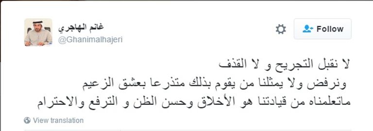 وقال الهاجري في تغريدات عبر حسابه على موقع التواصل الاجتماعي تويتر "نرفض ولا يمثلنا من يقوم بذلك متذرعا بعشق الزعيم.. ما تعلمناه من قيادتنا هو الأخلاق وحسن الظن والترفع والاحترام"، وذلك على خلفية إساءة بعض الجماهير إلى مهدي علي بسبب رفضه التفريط في لاعبي فريق العين المتواجدين في معسكر الأبيض.