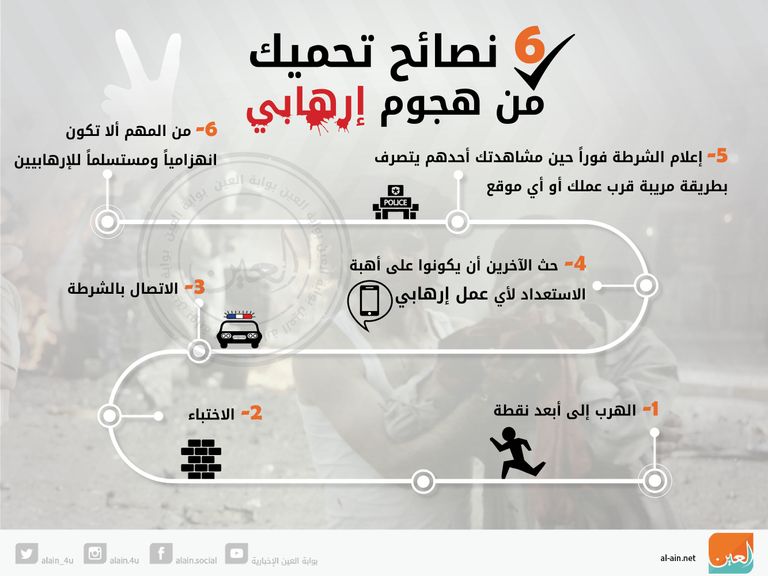 ترصد بوابة العين الإخبارية في الإنفوجراف التالي أهم النصائح التي عليك تذكرها إذا وقع هجوم إرهابي.