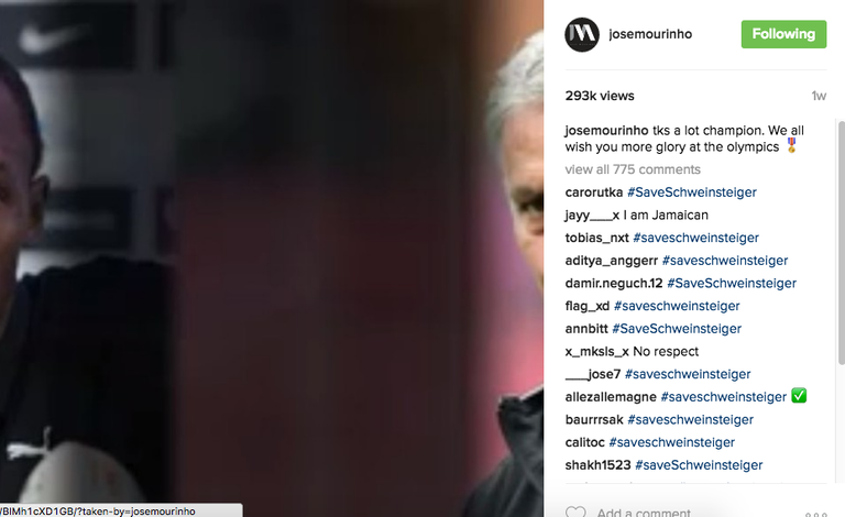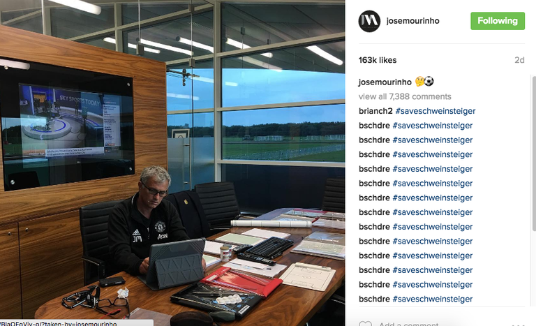 وبمجرد نشر مورينيو أي صورة على صفحته الشخصية بموقع "انستجرام"، يدخل محبة اللاعب الألماني بتعليقات كثيفة للغاية واضعين هاشتاق "حافظ على شفاينشتايجر"، بغرض حث المدرب البرتغالي على التراجع عن قراره.