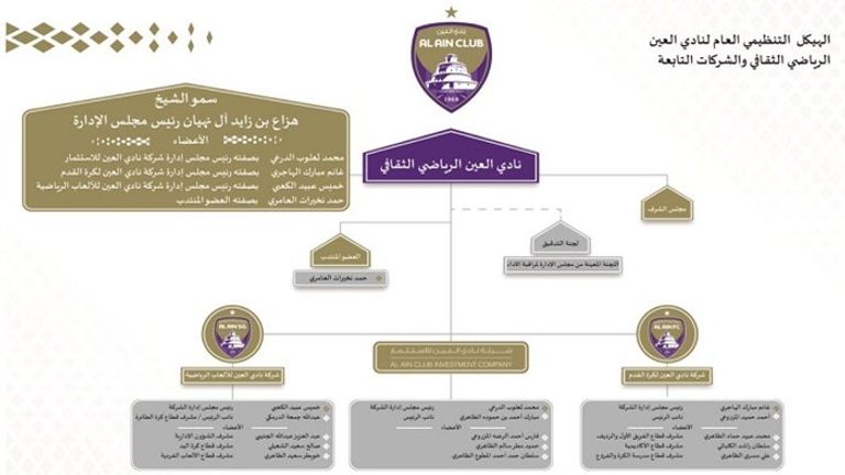وجاء في القرار أن المجلس يضم في عضويته كل من: محمد ثعلوب سالم الدرعي بصفته رئيس مجلس إدارة شركة نادي العين للاستثمار، وغانم مبارك الهاجري بصفته رئيس مجلس إدارة شركة نادي العين لكرة القدم، وخميس عبيد الكعبي بصفته رئيس مجلس إدارة شركة نادي العين للألعاب الرياضية، وحمد نخيرات العامري، وذلك بعد تعيينه عضواً منتدباً لنادي العين الرياضي الثقافي.