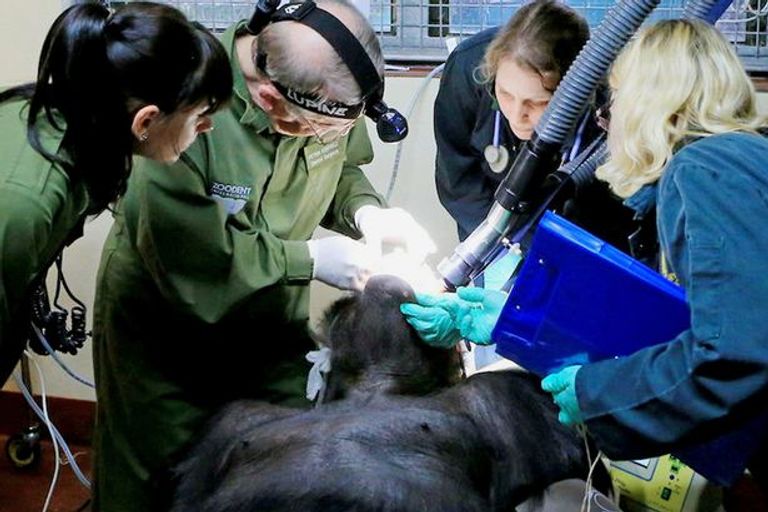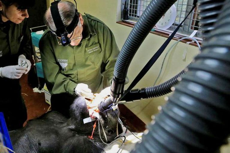 أجرى الفريق الطبي لحديقة حيوانات "بينتون"، عملية لمعالجة القنوات الجذرية داخل فم أكبر حيوان غوريلا في بريطانيا.