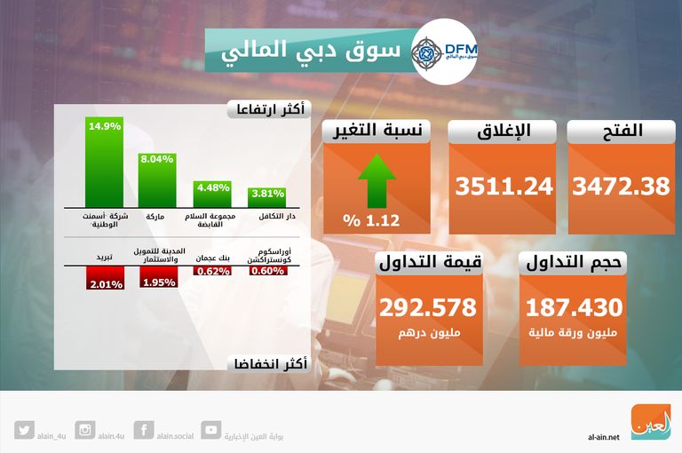 وارتفع المؤشر العام لسوق دبي المالي 1.12% إلى 3511.24 نقطة رابحًا 38.86 نقطة، لتسجل حجم التداولات 187.430 مليون ورقة مالية بقيمة إجمالية 292.278 مليون درهم تم تنفيذها خلال 2.927 ألف صفقة.