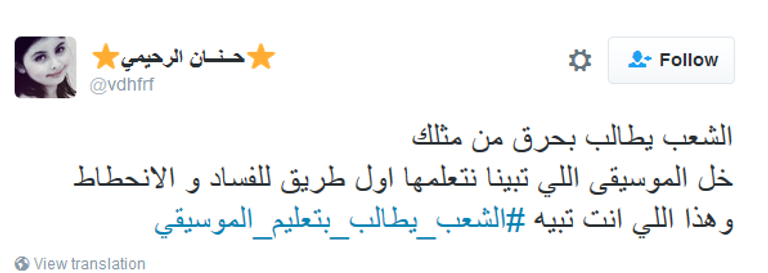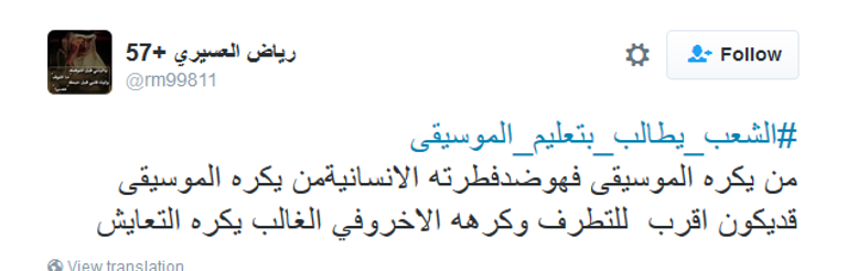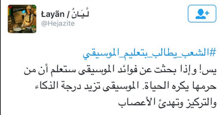 طالب هاشتاق سعودي على تويتر بالسماح بتعليم الموسيقى في المدارس مثل كثير من الدول العربية، لأن الموسيقى وفق مدشنه، تزيد درجة الذكاء والتركيز وتساعد على هدوء الأعصاب.