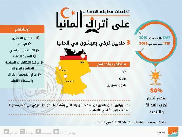 ترصد بوابة العين في الإنفوجراف التالي، وضع الجالية التركية في ألمانيا وما وتداعياتها بعد الانقلاب العسكري الفاشل.