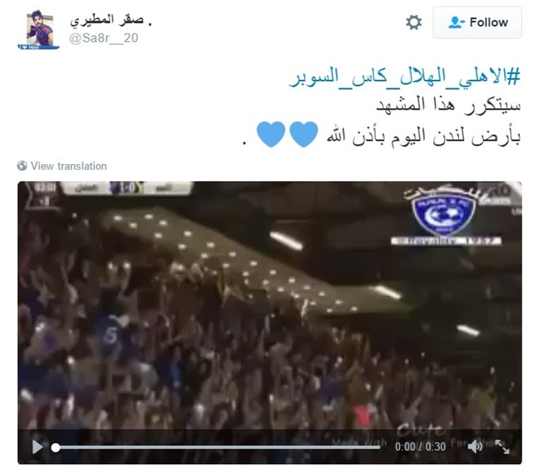 على الجانب الآخر، كانت العاصمة البريطانية مصدر تفاؤل بين جماهير الزعيم، لأن الهلال فاز فيها بالنسخة الماضية من كأس السوبر على غريمه التقليدي النصر بهدف للبرازيلي إدواردو، وظهر ذلك التفاؤل في العديد من التغريدات، ظهرت في واحدة منها ساعة "بيج بن" أشهر معالم عاصمة الضباب بجوار شعار الهلال، في إشارة لما تحمله المدينة من ذكريات سعيدة للهلاليين.