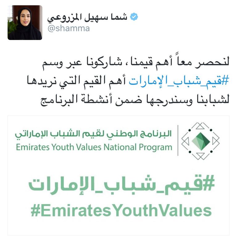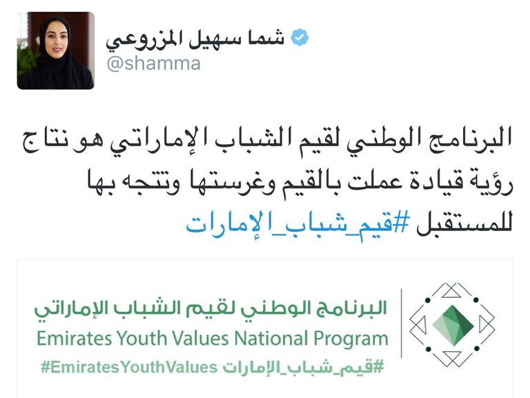 دعت شما بنت سهيل المزروعي، وزيرة الدولة لشؤون الشباب، عبر حسابها في موقع التواصل الاجتماعي "تويتر"، شباب الإمارات للمشاركة في تحديد أهم القيم والمبادئ الإماراتية ضمن "البرنامج الوطني لقيم الشباب الإماراتي".