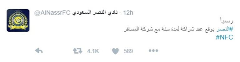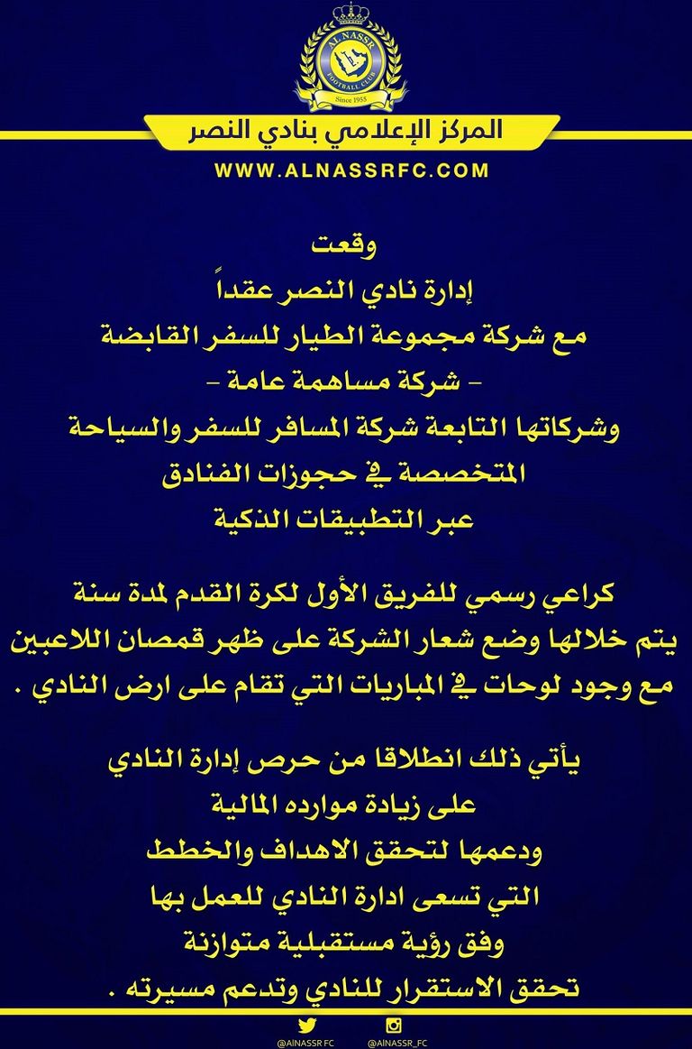 أعلن نادي النصر السعودي مساء أمس الثلاثاء، عبر حسابه الرسمي على موقع التواصل الإجتماعي "تويتر"، عن توقيعه عقد رعاية جديد.