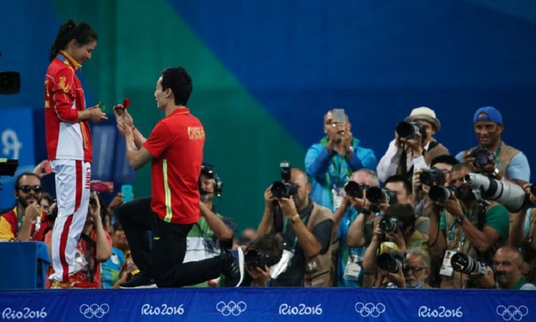 لم تكد تمر سوى دقائق على حصول الصينية هي زي على فضية الغطس من على منصة مرنة من ارتفاع ثلاثة أمتار في دورة الألعاب الصيفية (ريو 2016) حتى وجدت أمامها مفاجأة تمثلت في زيارة من رفيقها العاطفي الذي طلب منها الزواج أمام الجمهور المتواجد في مركز (ماريا لينك) للألعاب المائية.