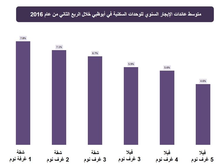 وقال ديكلن ماك نوتن، المدير العام لشركة "تشيسترتنس" الشرق الأوسط في الإمارات: "على الرغم من انخفاض أسعار المبيعات والإيجارات في الربع الثاني إلا أن عائدات تأجير العقارات السكنية لا تزال مجزية للمستثمرين، وهذا ما يؤكد أن مدينة أبوظبي ما تزال خياراً جيداً، فعلى سبيل المثال سجلت فلل الريف داون تاون معدلاً مرتفعاً لعائدات التأجير السنوي بلغ 8,8٪ وحققت منطقة الغدير نسبة بلغت 7,7٪ تليها منطقة المنيرة بنسبة 7,5٪".