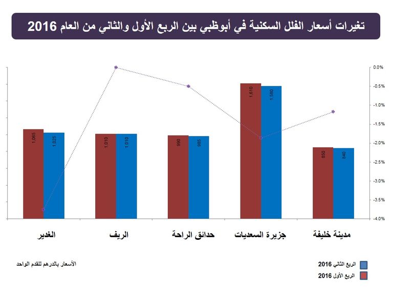 وقد تأثرت مشاريع تطوير الشقق السكنية التي شهدت زيادة خلال الربع الأول بسبب انخفاض مستويات الإنفاق وشهدت تغيراً في الأسعار، فقد انخفض السعر في مشروع الزينة إلى 1,495 درهم للقدم المربع من 1,520 درهم في الربع الأول، وكذلك الحال في منطقة الريف داون تاون حيث انخفض السعر من 930 إلى 925 درهما للقدم المربع، وبهذا تعود الأسعار في هاتين المنطقين إلى المعدلات السابقة في الربع الرابع من العام 2015.