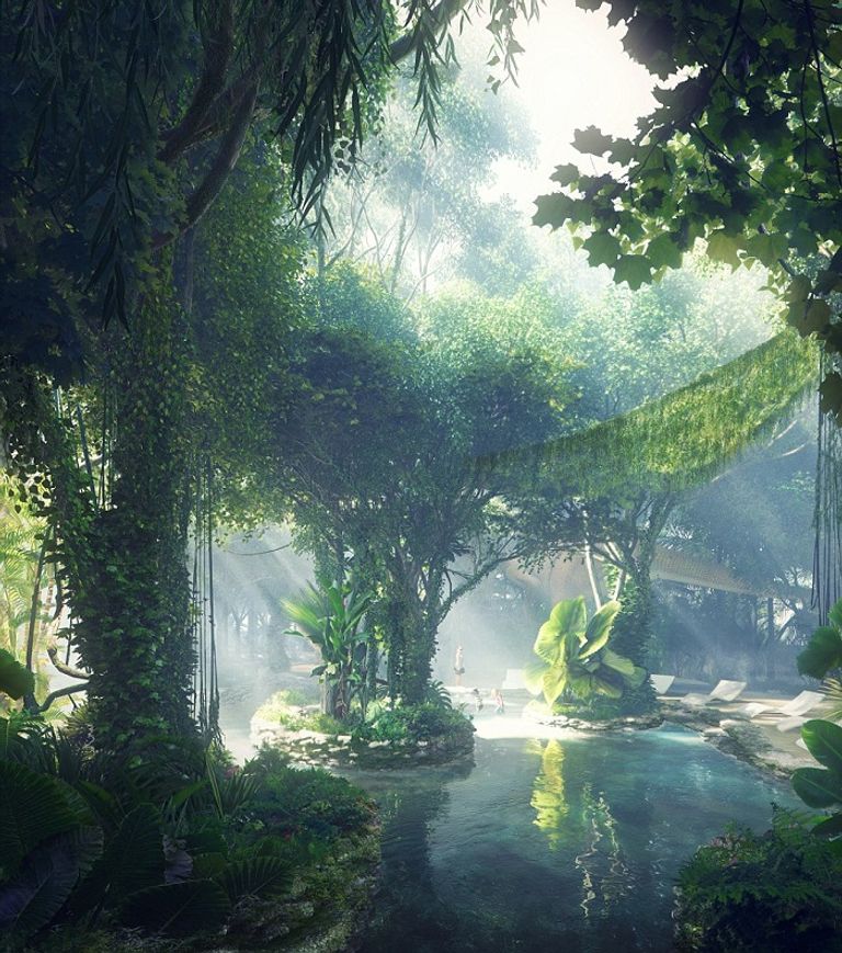 وتعطي رسومات وتصاميم الفندق والمشروع السكني فئة الخمس نجوم، الذي سوف تديره شركة هيلتون الرائدة، لمحة عن مساحته التي تصل إلى حوالي 75 ألف قدم مربع، الغابة الاصطناعية.