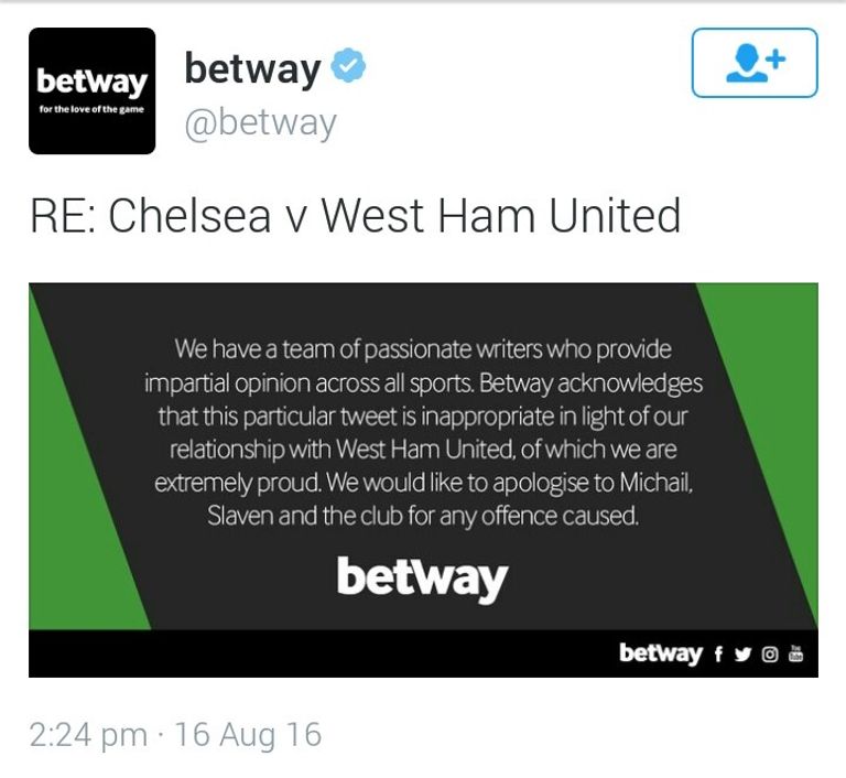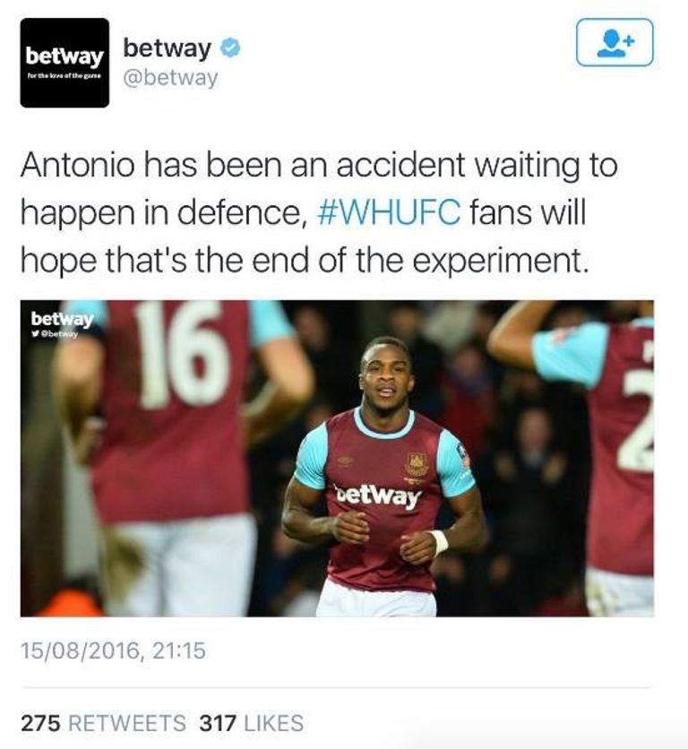 ونشر حساب الوكالة على موقع التواصل الاجتماعي "تويتر" تغريدة يعتذر فيها لمشجعي ويستهام عن تدخل أنطونيو الظهير الأيمن، والذي كان سببا في خسارة فريقه للمباراة، مشيرا إلى أن مشجعي الهامرز يتمنون ألا يتكرر مثل هذا التصرف منه حتى لا يخسروا المباراة مثلما حدث أمام تشيلسي.