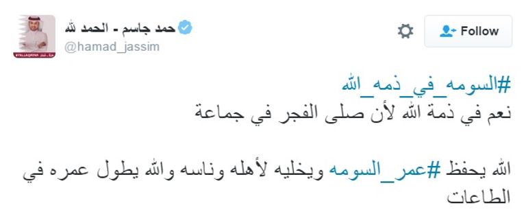 وقد انتشر في الساعات الأخيرة على موقع التواصل الاجتماعي تويتر هاشتاق بعنوان "السومة في ذمة الله"، والذي لاقى ثورة غضب من الغالبية العظمى من المغردين على اختلاف انتماءاتهم وألوانهم، معتبرين الهاشتاق يدل على جهل وتعصب أعمى من مطلق شرارته.