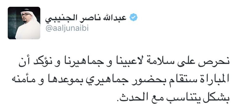 وقال الجنيبي عبر حسابه على موقع التواصل الاجتماعي "تويتر": "نحرص على سلامة لاعبينا وجماهيرنا، ونؤكد على أن المباراة ستقام بحضور جماهيري في موعدها، وستكون مؤمنة بشكل يتناسب مع الحدث".