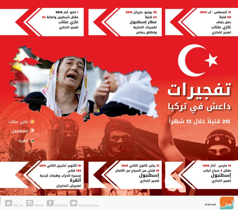 ووفقًا لبيانات وأرقام رصدتها بوابة "العين" الإخبارية فإن عدد قتلى تفجيرات "داعش" خلال 12 شهرًا في تركيا بلغ نحو 215 قتيلًا.