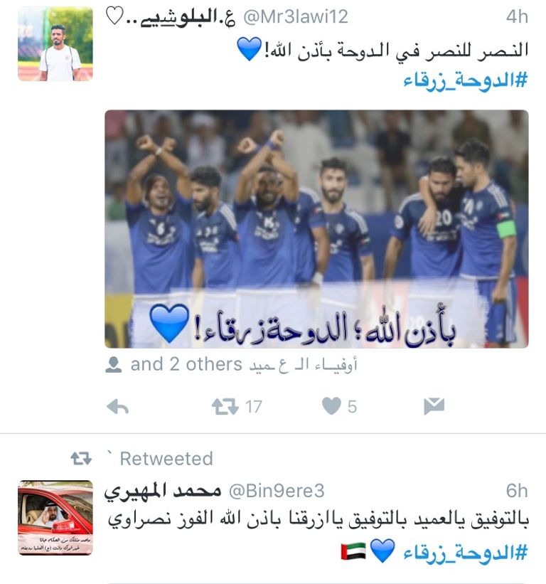 تواصل جماهير النصر الإماراتي دعمها لفريقها خلال مشواره الآسيوي عبر موقع التواصل الاجتماعي "تويتر"، حيث دشنت الجماهير النصراوية في هذا الصدد هاشتاق "الدوحة زرقاء"، الذي تصدر تويتر خلال الساعات الماضية قبل لقاء الفريق مع الجيش القطري.