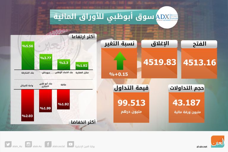 وأغلق مؤشر سوق أبوظبي المالي مرتفعا 0.15% ليغلق عند 4519.83 نقطة، بعد التداول على 43.187 مليون ورقة مالية حققت سيولة 99.513 مليون درهم، تم تنفيذها من خلال 1.093 ألف صفقة.