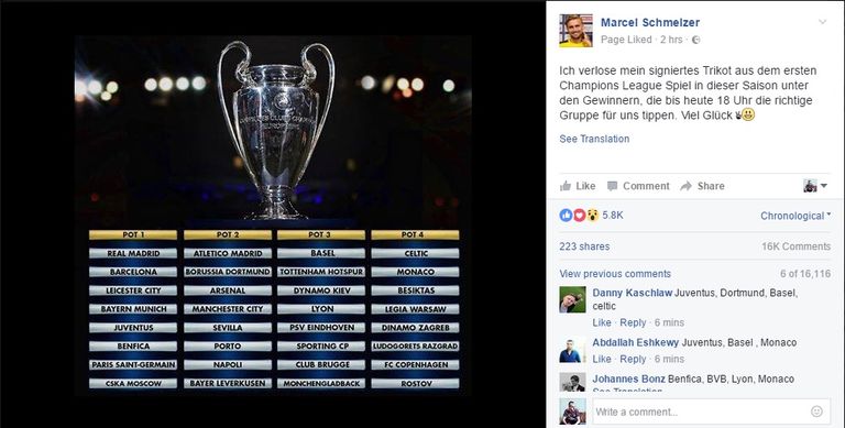 ونشر اللاعب الألماني عبر حسابه بموقع التواصل الاجتماعي "فيس بوك" صورة للأندية المشاركة في دور المجموعات حسب التصنيفات الأربعة، وعلق عليها قائلًا: "سأمنح قميصي بأول مباراة في دوري الأبطال لصاحب التوقع الصحيح لمجموعتنا هذا الموسم".