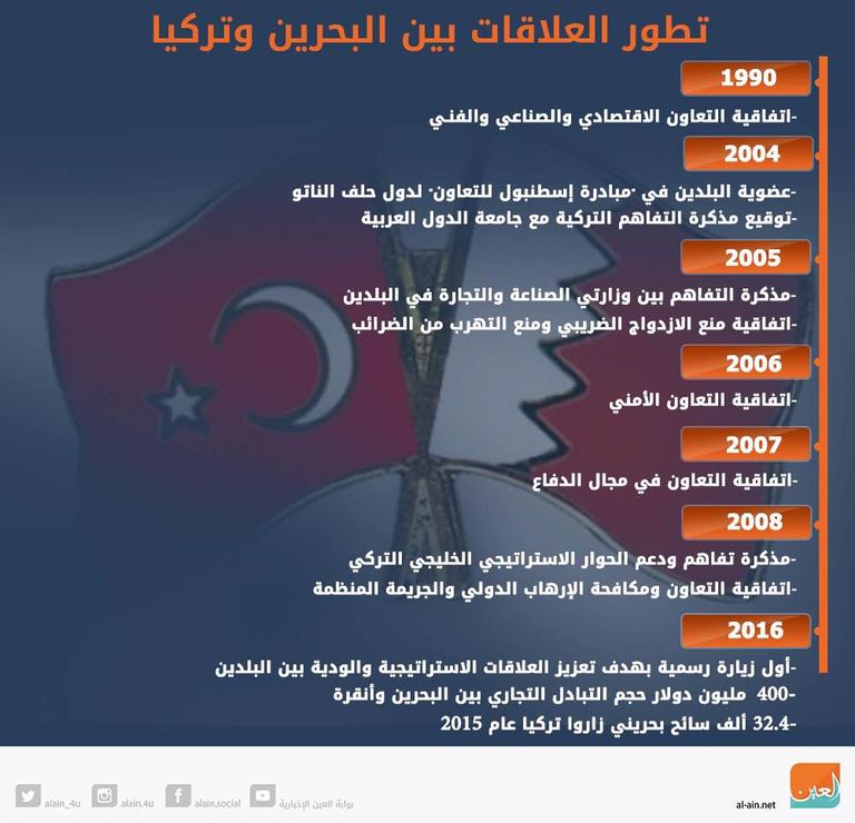 إنفوجراف يلخص العلاقات البحرينية والتركية بالسنوات منذ عام 1990 إلى 2016.