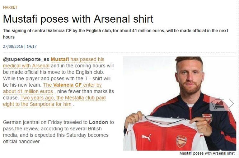 وقعت صحيفة إسبانية في خطأ فادح، بعدما نشرت خبرًا لتوقيع شكودران مصطفي لاعب فريق فالنسيا مع أرسنال الإنجليزي، وأرفقت مع الخبر صورة ذكرت أنها للمدافع الألماني مع قميص الجانرز، وتبيّن فيما بعد أن الصورة ملفقة، وأن الصفقة لم تتم بشكل رسمي.