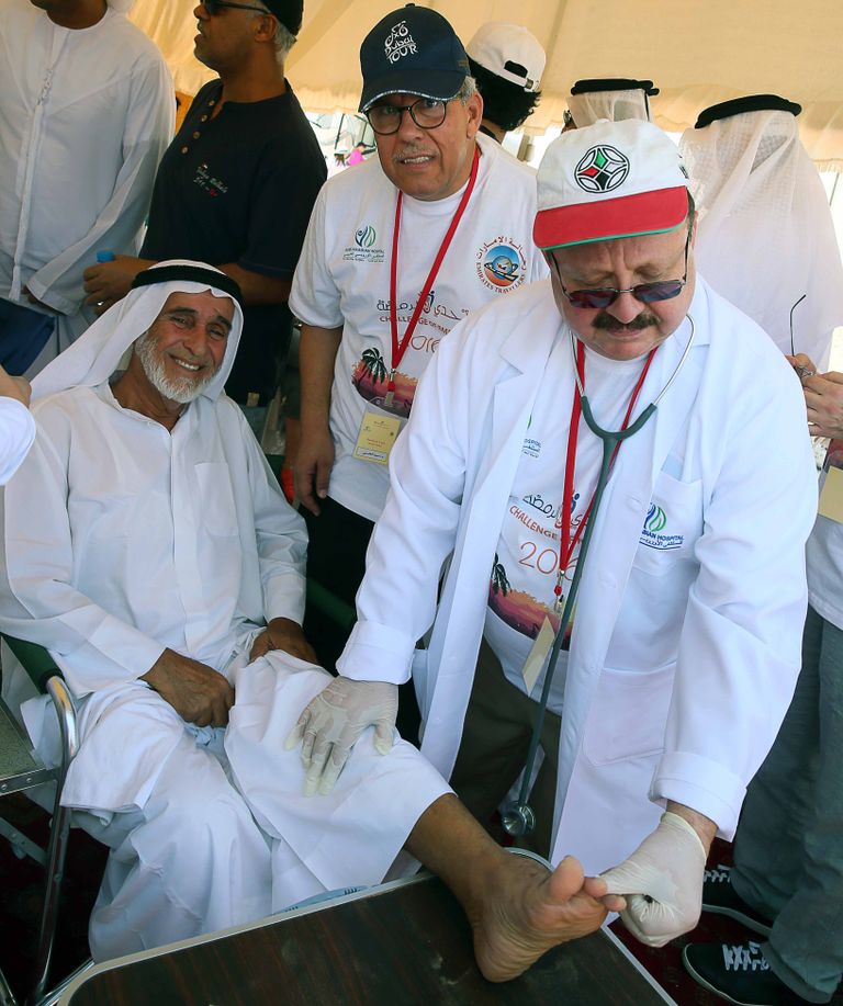 عند مدخل منطقة التحدي وقف عوض بن مجرن، رئيس نادي رحالة الإمارات مرحباً بزائريه الذين قطعوا المئات من الكيلومترات من أجل حضور تلك البطولة.